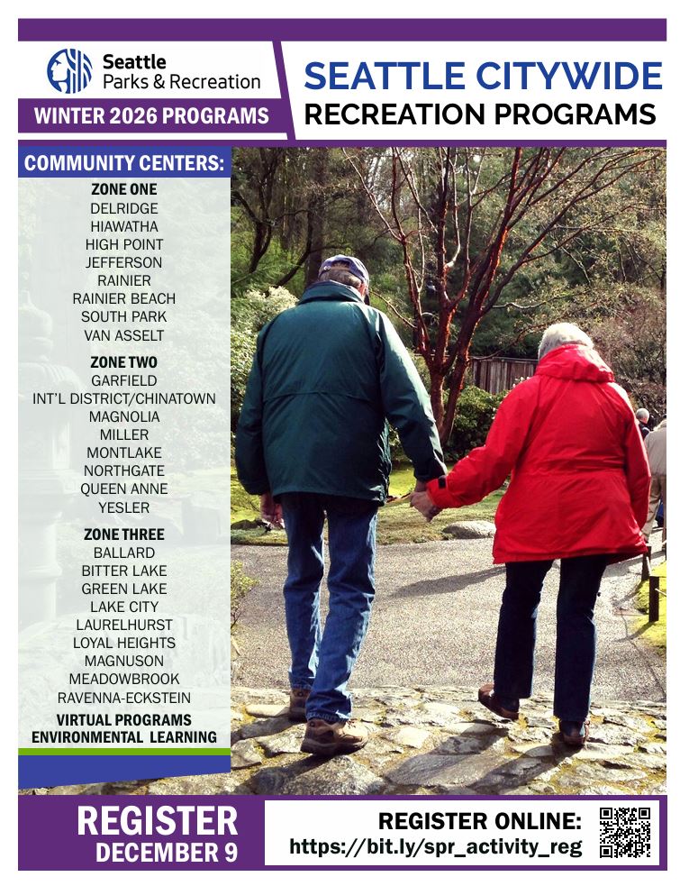 Seattle Parks and Recreation’s Winter 2026 program brochures are here! You’ll find all the in-person, drop in and virtual programs that are coming up soon in the catalogs below.