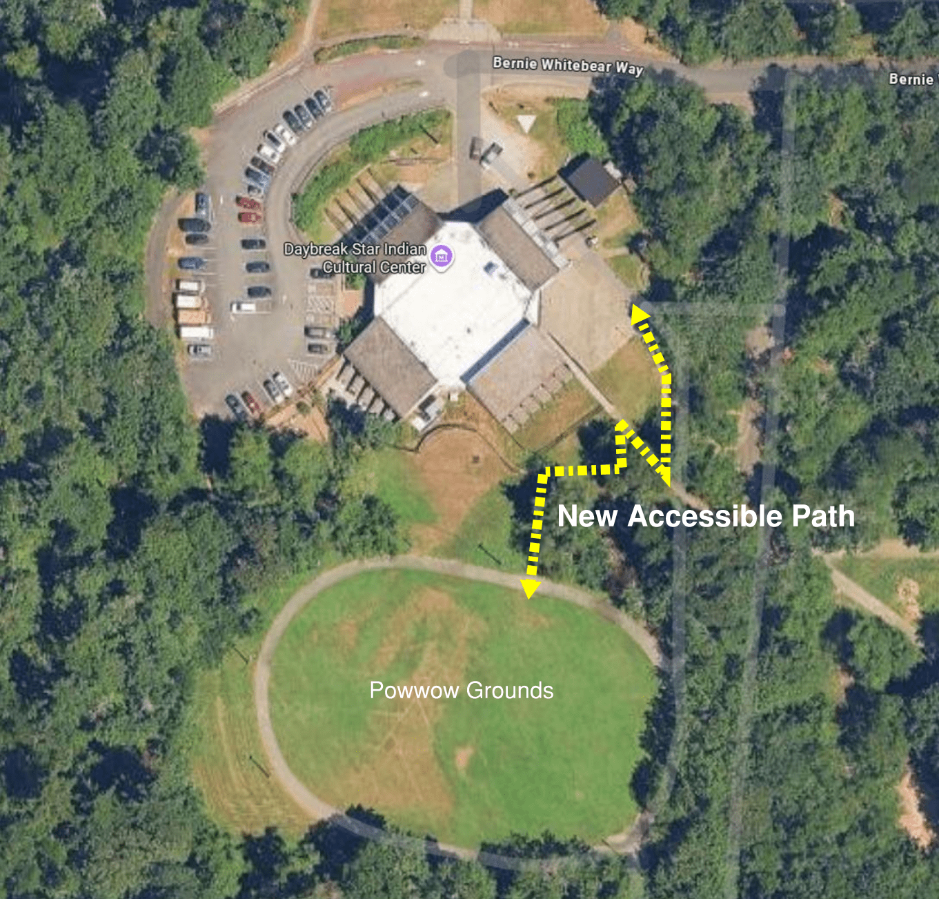 Together, SPR and UIATF have completed the initial phase of planning and conceptual design for the pathway. The project will focus on a new accessible and illuminated path from the Daybreak Star Center Indian Cultural Center’s lower entrance to the Powwow Grounds. In addition to the planned accessible path, we are coordinating with the Seattle Department of Transportation (SDOT) to add a new sidewalk to the portion of Bernie Whitebear Way closest to Daybreak Star. This SDOT-led sidewalk is planned for 2028.